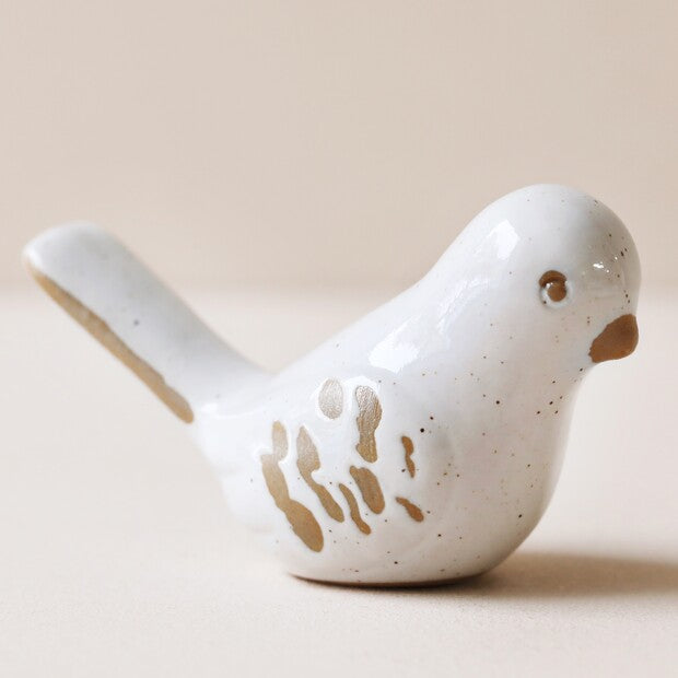 Made of smooth ceramic, this beautiful bird features an off-white glaze to the surface with wax-resist spots exposing the natural ceramic underneath. The perfect rustic home accessory, this bird has a long tail pointed upwards, leaving room for plenty of rings to be stacked for safe-keeping and easy storage.