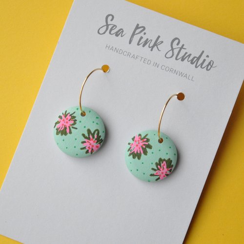 Bright floral hoop earrings with an arty flower design inspired by colourful dahlias, made with wooden beads. Lightweight and comfortable to wear.