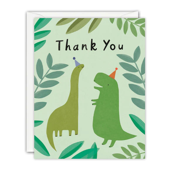 A pack of five high quality thank you cards illustrated by Kate Mainard and printed on textured cream board. The image features two green dinosaurs wearing party hats, surrounded by foliage. The text on the front of the cards reads 'Thank You'.