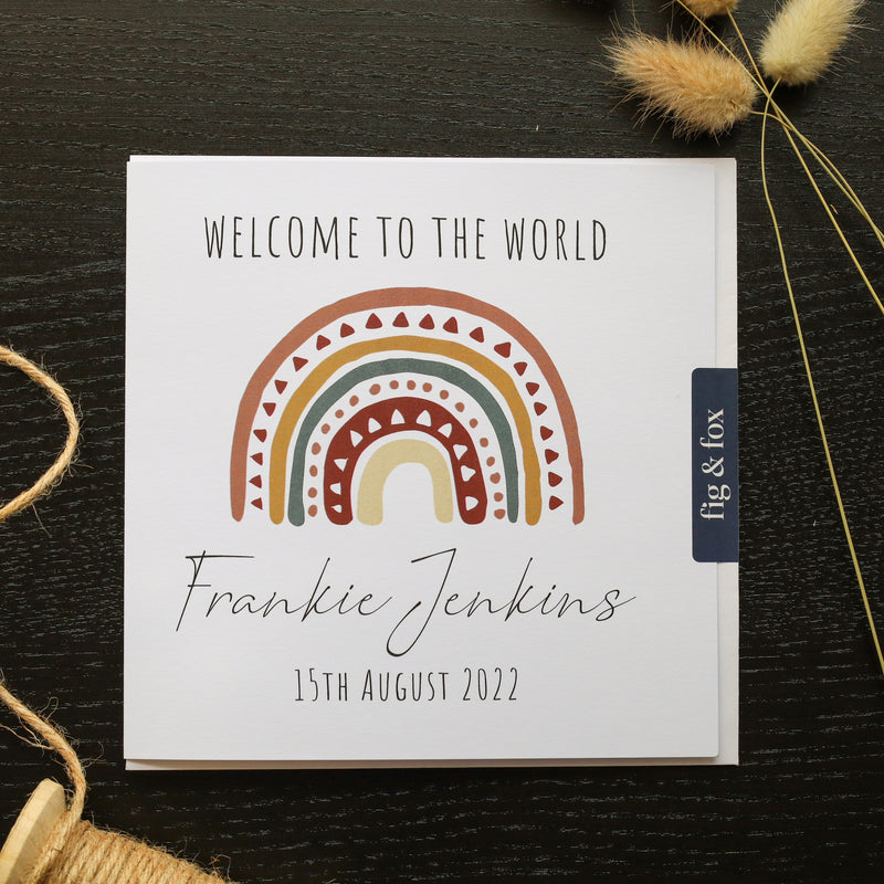 Welcome a new baby in style with this beautiful, bohemian rainbow card. A unique personalised way to let someone special in your life know they are loved, it's sure to make their birthday even brighter!